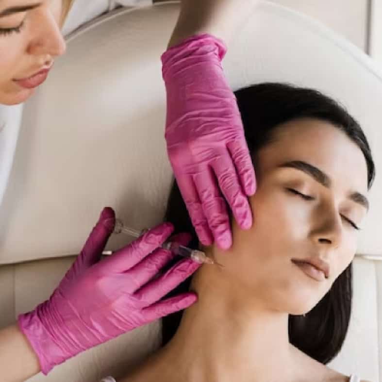 Woman receiving dermal filler injection for facial rejuvenation at Dolce Aesthetics clinic.
